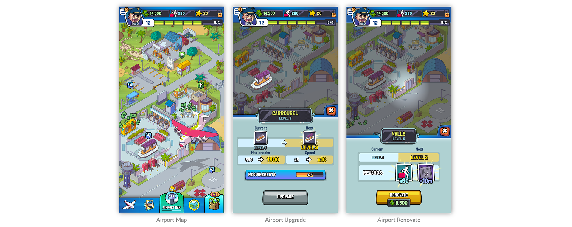 Below you can check a couple of screenshots that represent the main flow of the game. You can check all screens, with multiple states and pop-ups, by playing the game. Available in App Store and Google Play Store.