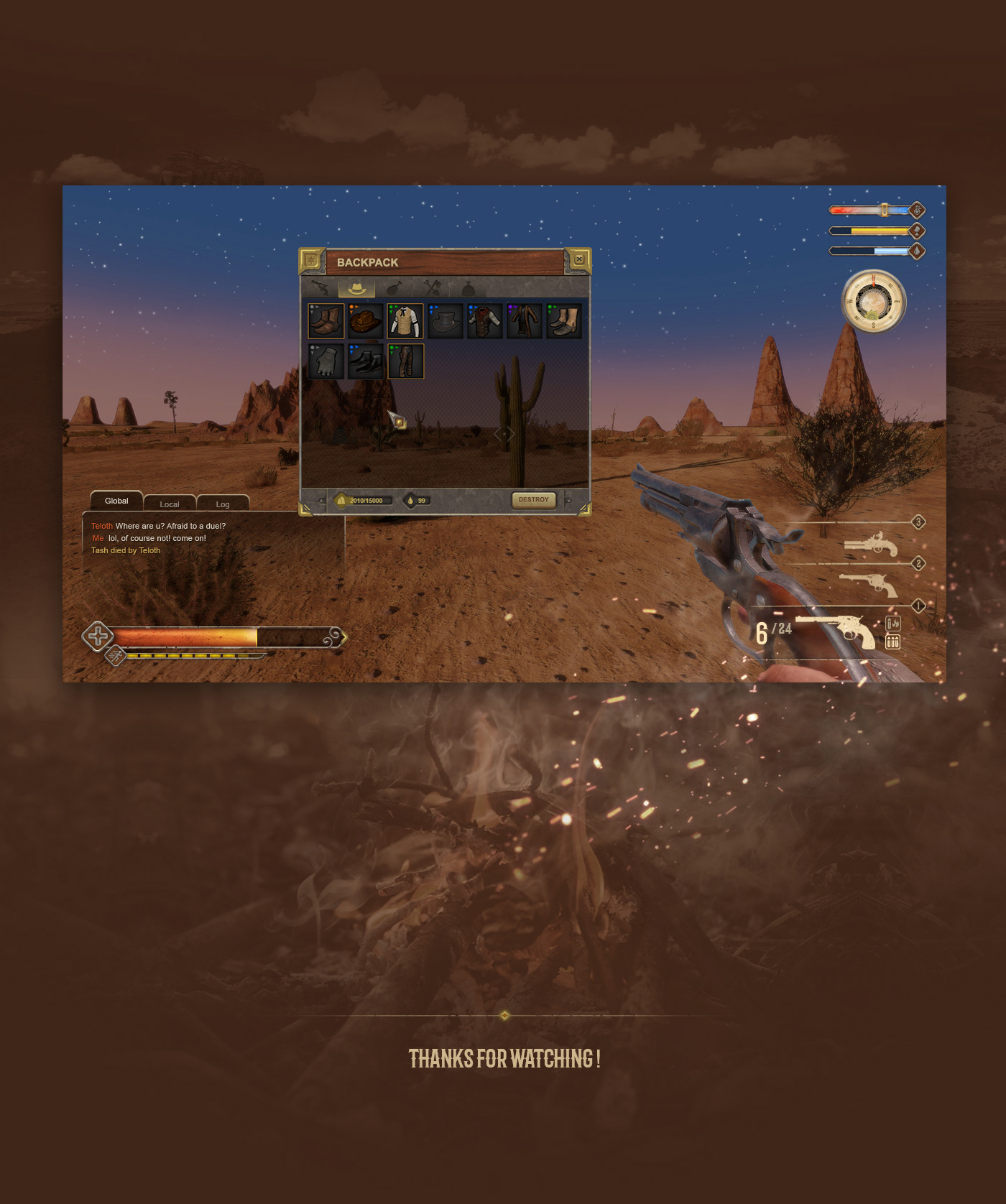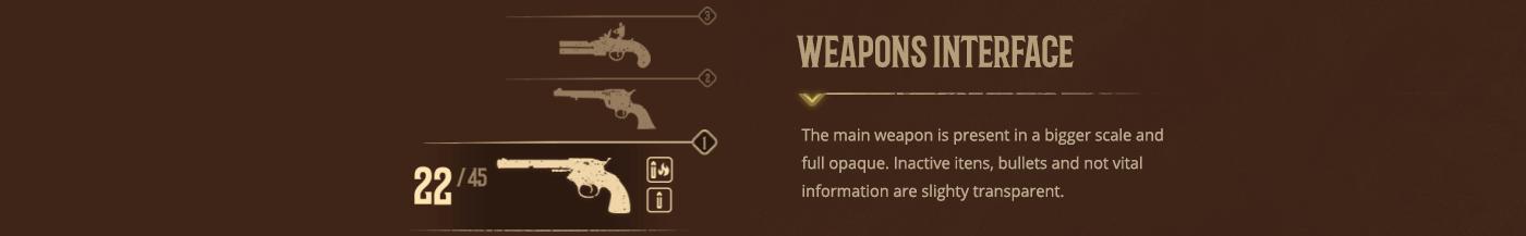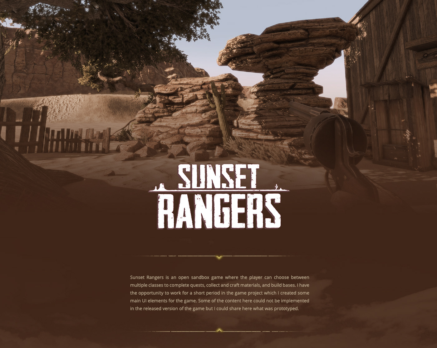Sunset Rangers - UI Design: Production of main UI components for steam game with western theme. In this project I created the basic window frame, cursor, compass, different purpose bars, weapon selector and chat area.